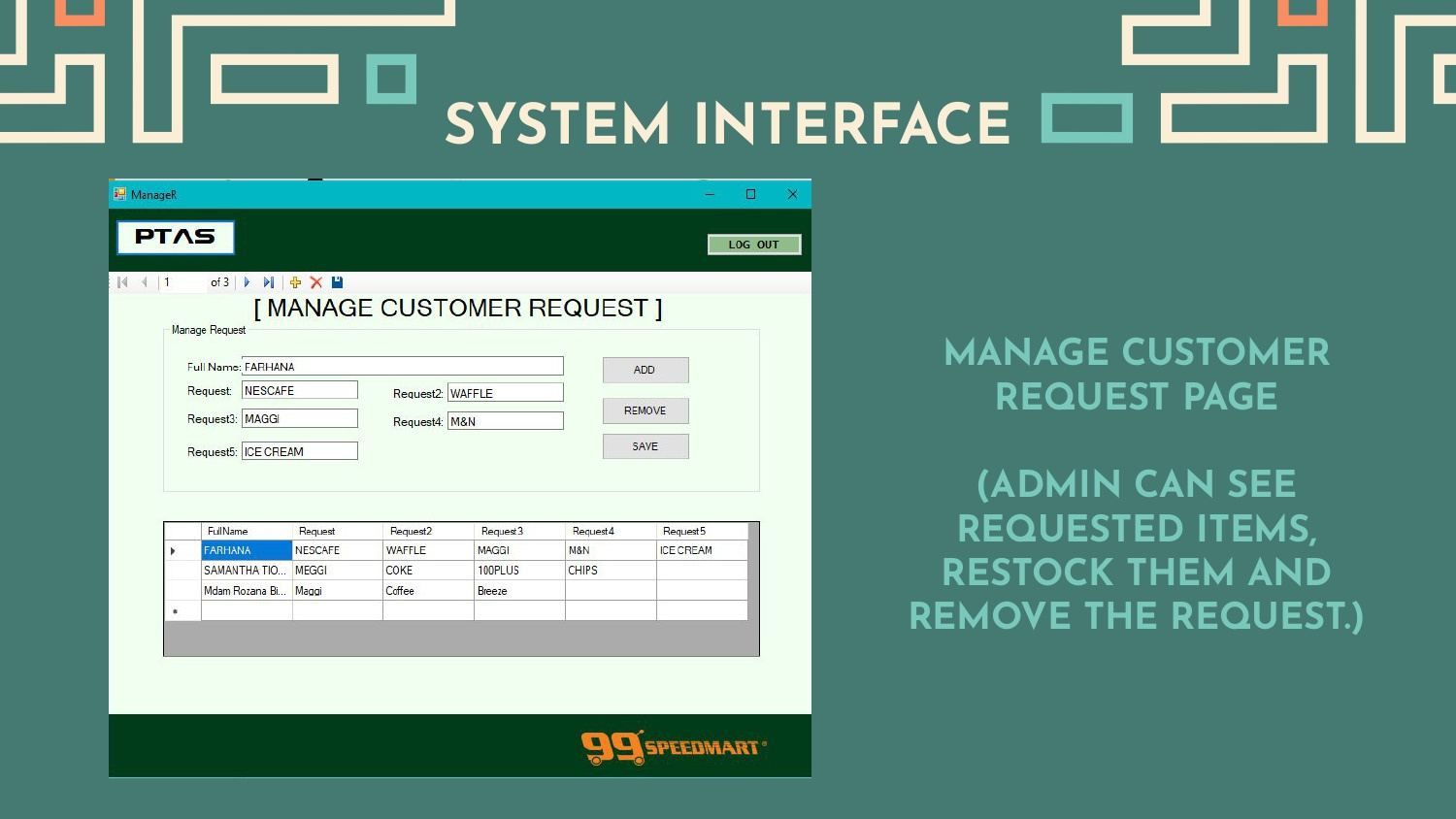 This group project was under the subject of "System Analysis And Design Method (SADM)". We were assigned to observe and identify the store of our choice's main problem. Our team has chosen 99 Speedmart as the target. Since contacting the stakeholders' process will be long, we decided to conduct a customer survey through Google Form instead. From our investigation. We conclude that the store's main problem is restocking latency. Therefore, we developed a prototype system based on the problem statement.
