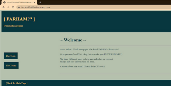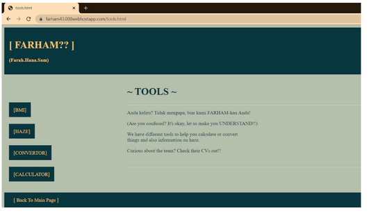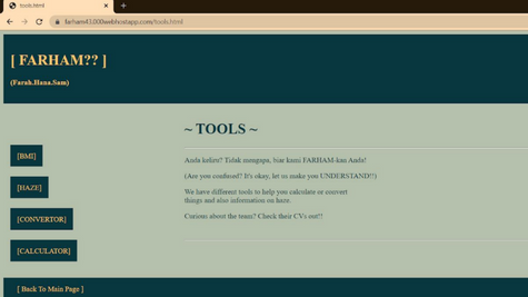 A group assignment for the "Web Programming" subject, built using PHP and HTML. It's an online multi-usage website containing a converter, calculator, BMI calculator, and haze indicator. The page includes team members profiles in the main menu.