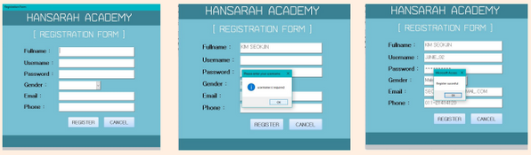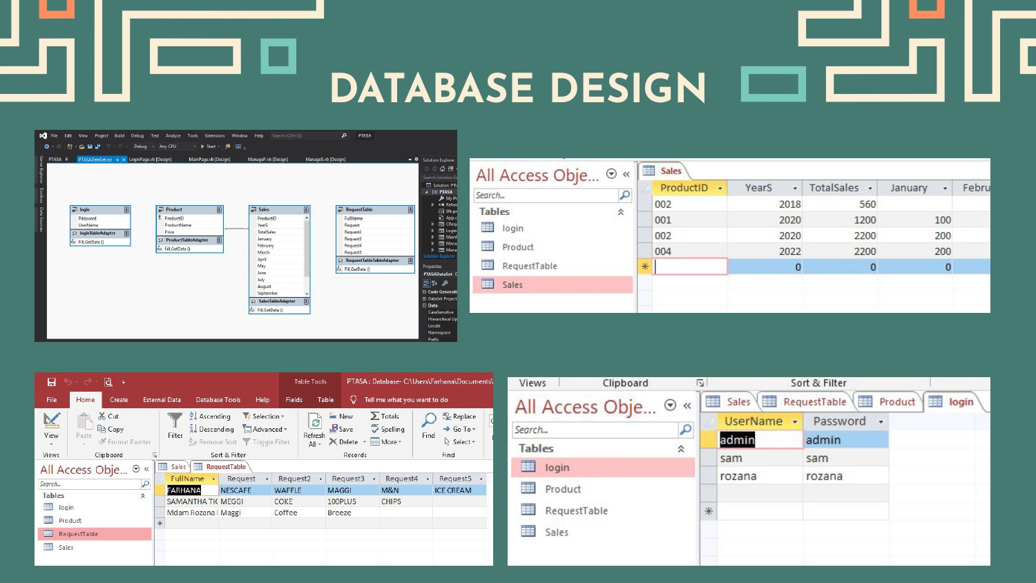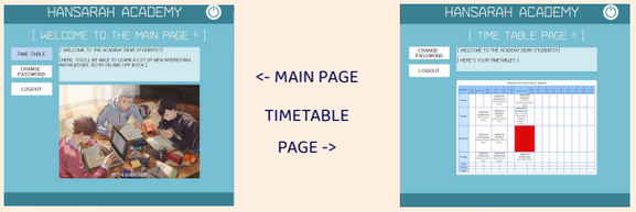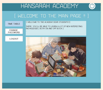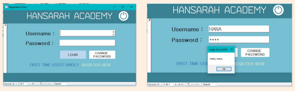 A project for the "Database" subject, built using Microsoft Access. It's a simple system that allows users to log in, sign-up, change passwords and see their timetable. HanSarah indicates the team members' names; Farhana, Sam and Farah.